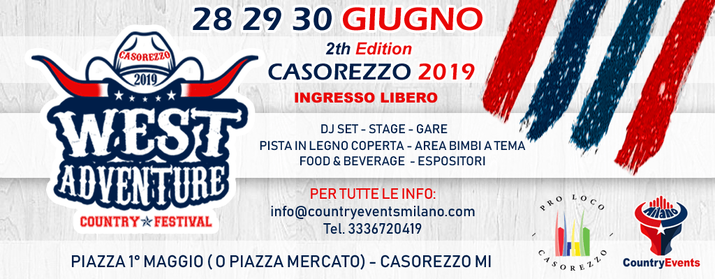 Un super evento dedicato la Country style. Dj Set, Pista in Legno, Stage, Ballerini, Gare, Area Bimbi a tema western, Espositori e Food & Beverage…E TANTO COUNTRY!! Un evento realizzato da CountryEvents Milano in collaborazione con la Pro Loco di Casorezzo MI.