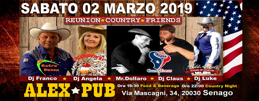EVENTI COUNTRY: Reunion Country Friends a Senago MI con tag Country Night / Reunion Country Night di marcodollaro Sabato 02/03/2019 Un grande appuntamento Country vi aspetta all’Alex Pub di Senago Mi. Reunion Country Friends 2019!! In consolle per voi: Dj Franco, Dj Angela, Mr. Dollaro, Dj Claus e Dj Luke. AMPIA LOCATION E GRANDE PISTA IN LEGNO!!! STAGE IN SALA 2 Ore 21:15 con Valentina INIZIO SERATA. Ore 22:00 INGRESSO € 10,00 con consumazione . DOVE: Alex Pub Via Mascagni 34 Senago MI . PER INFO E PRENOTAZIONI: info@countryeventsmilano.com Tel. 333 6720419
