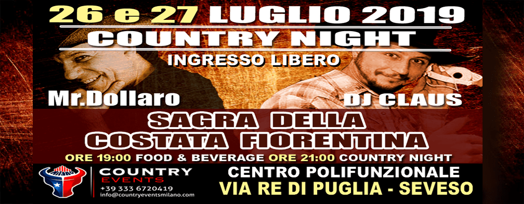 EVENTI COUNTRY: Venerdì e Sabato Country Night a Seveso MB con tag Ballare / ballerini / Centro polifunzionale / cesate / Corsi / country / Country Line Dance / cucina italiana / Dance / EVENTI COUNTRY / eventi country a milano / Line / Lombardia / musica / Musica Country / pizzeria / Serate / serate country a milano / Serate Country Milano / Seveso di marcodollaro VENERDì 26 E SABATO 27/07/2019 Appuntamento country al centro Polifunzionale di Seveso, in occasione della Sagra della Costata Fiorentina!! INGRESSO LIBERO . Ad attendervi in consolle: Venerdì 26: Mr. Dollaro Sabato 27: Mr. Dollaro & Dj Claus. INIZIO SERATA ORE 21:00 DOVE: Centro Polifunzionale Via Re di Puglia – Seveso PER INFO: info@countryeventsmilanio.com Tel. 333 6720419.