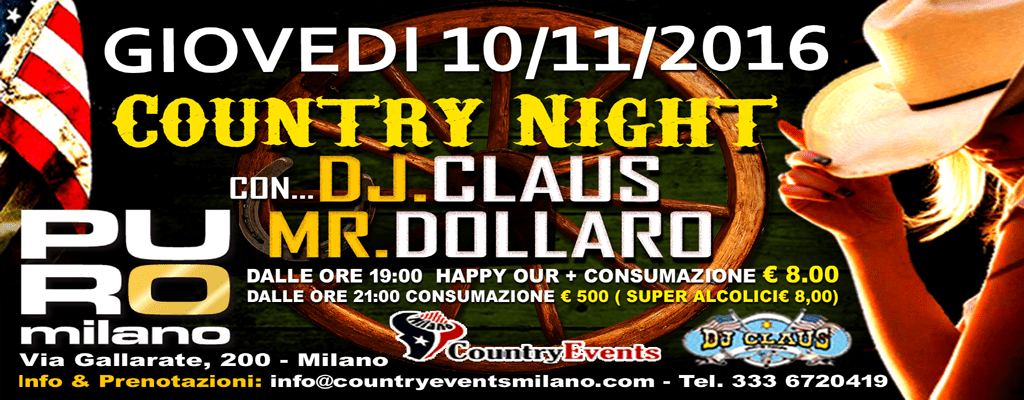 Giovedì 10/11/2016 Country Night con Dj Claus & Mr.Dollaro al Puro Milano. Dalle 19:00 Happy Hour con Buffet e consumazione € 8:00 Dalle 21:30 Country Night Consumazione € 5,00 ( superalcolici € 8.00) . Per info e prenotazioni: Tel. 333 6720419 E-mail: info@countryeventsmilano.com
