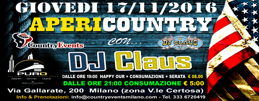 Giovedì 17/11/2016 Country Night con Dj Claus & Mr.Dollaro al Puro Milano. Dalle 19:00 Happy Hour con Buffet e consumazione € 8:00 Dalle 21:30 Country Night Consumazione € 5,00 ( superalcolici € 8.00) . Per info e prenotazioni: Tel. 333 6720419 E-mail: info@countryeventsmilano.com