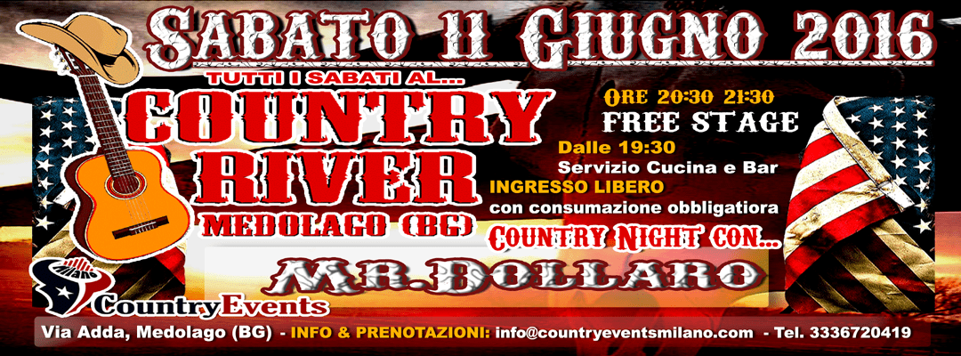 Sabato 11/06/2016 un sssuuuuppppeeeerrr serata al Country River di Medolago (BG). Un location suggestiva a soli pochi metri dalla riva dell’Adda, completamente immersa nel verde. CountryEvents Milano vi spetta per una fantastica country night sotto le stelle!! In consolle Mr. Dollaro.