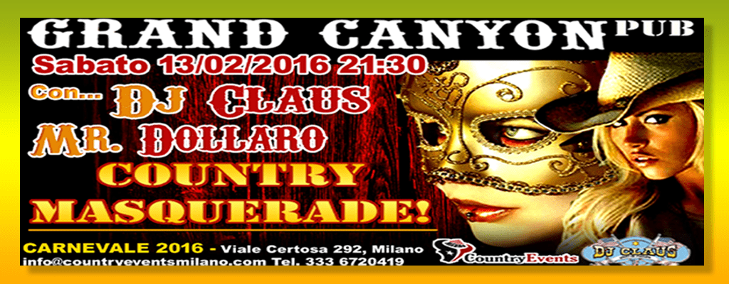CARNEVALE 2016 – CountryEvents Milano Vi aspetta per trascorrere insieme uno degli eventi più attesi della stagione invernale: il Country Masquerade!!!! Una notte esilarante di pazze follie e puro divertimentooooo nelle vesti del vostro personaggio preferitoooo!