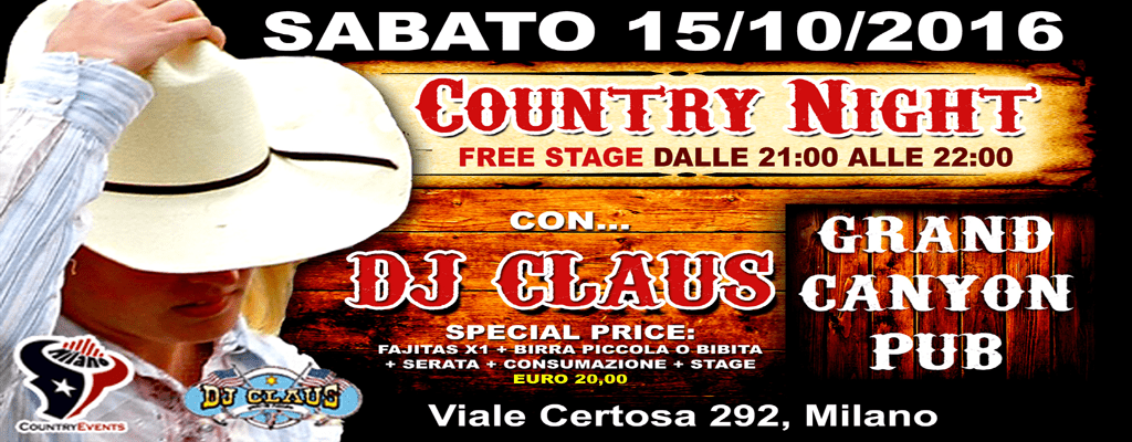 Sabato 15/10/2016 – Vi aspettiamo al mitico Grand Canyon Pub, super caricatissimi e pronti per farvi scatenare sulle note della migliore country music del momento con DJ CLAUS