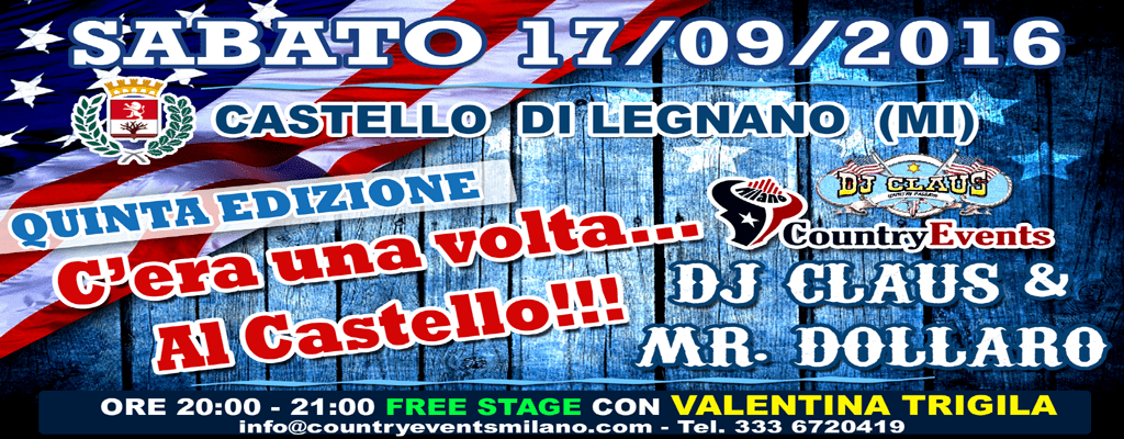 Sabato 17 Settembre 2016 CountryEvents Milano con Dj Claus e Mr. Dollaro vi aspettano per una fantastica Country Night all’interno di una location davvero suggestiva come il Catsello Visconteo di Legnano (MI)