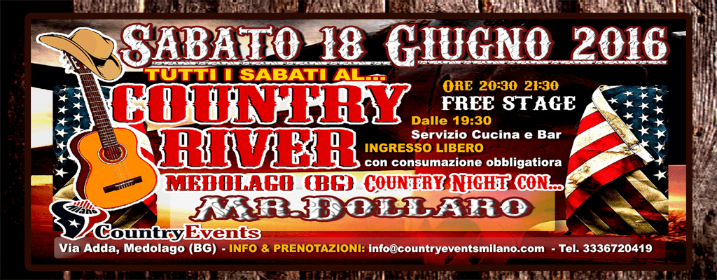 Sabato 18/06/2016 un sssuuuuppppeeeerrr serata al Country River di Medolago (BG). Un location suggestiva a soli pochi metri dalla riva dell’Adda, completamente immersa nel verde. CountryEvents Milano vi spetta per una fantastica country night sotto le stelle!! In consolle Mr. Dollaro.