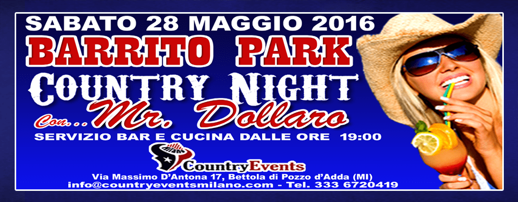 SABATO 28/05/2016 CountryEvents Milano vi aspetta al Barrito Park di Bettola di Pozzo d’Adda per una fantastica country night sotto le stelle con Mr. Dollro in consolle!!!!!