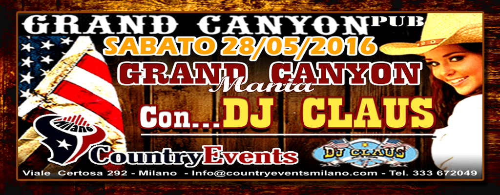 Sabato 28/05/2016 – Vi aspettiamo al mitico Grand Canyon Pub, super caricatissimi e pronti per farvi scatenare sulle note della migliore country music del momento con Dj Claus