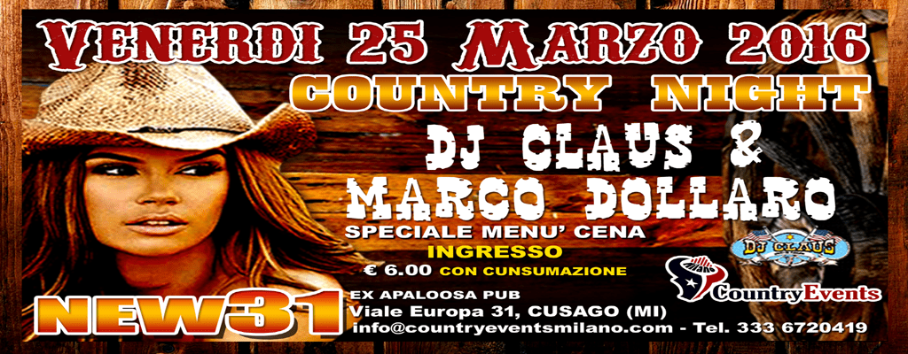 Venerdì 25/03/2016 nuvissima Country Night al New31 ex Apaloosa Pub di Cusago MI).